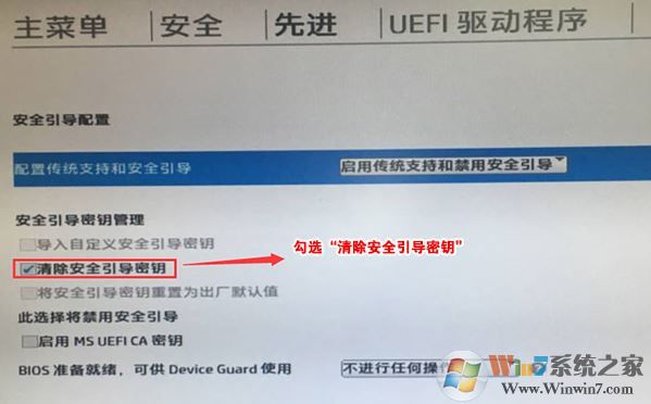 4、F10保存重啟后再次開(kāi)機(jī)按ESC,然后選擇F10進(jìn)入BIOS設(shè)置,將進(jìn)入剛設(shè)置的地方,勾選“清除安全引導(dǎo)密鑰”,然后再次F10保存;