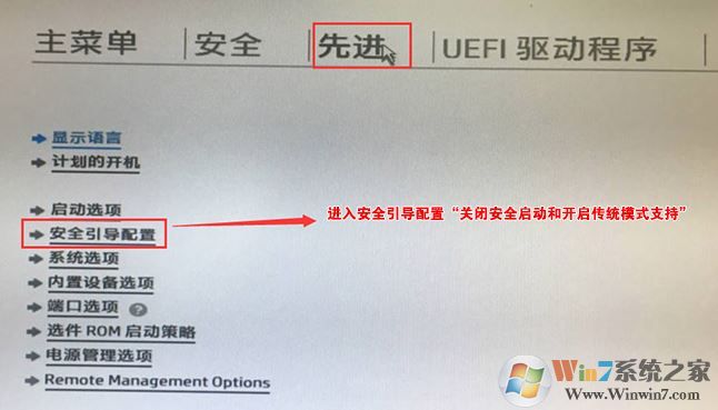 2、進(jìn)入BIOS后,將移動(dòng)鍵盤(pán)到“先進(jìn)”選項(xiàng)下,選擇"安全引導(dǎo)配置",按回車(chē)鍵進(jìn)入設(shè)置;