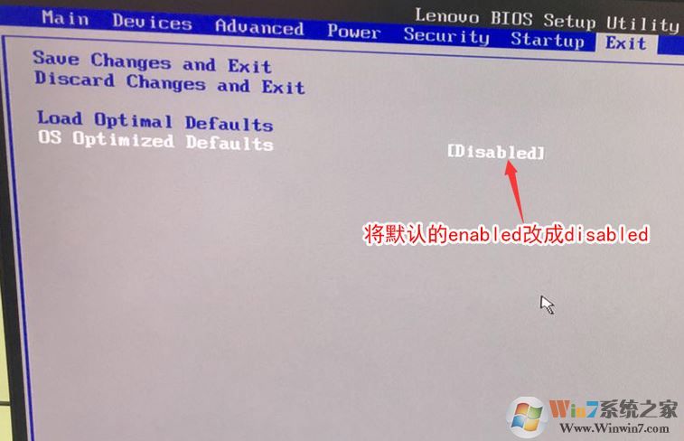2、轉(zhuǎn)到Exit,把OS Optimized Defaults設(shè)置為Disabled;