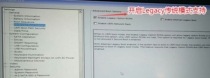3、切換到Advanced Boot Options將右邊的Enable legacy option roms選項(xiàng)打勾,如下圖: