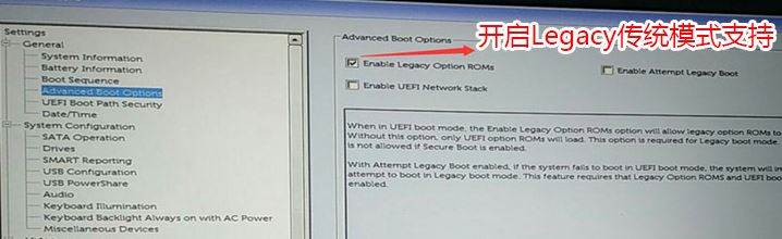 3、切換到Advanced Boot Options將右邊的Enable legacy option roms選項(xiàng)打勾,如下圖所示;