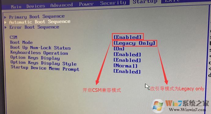 3、切換到Boot,把Boot Mode從UEFI改成Legacy only引導(dǎo)模式,再把csm默認disabled改成enabled,開啟兼容模式,選擇F10保存設(shè)置,在彈出的選項中選擇YES;