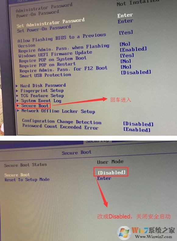 1、開機一直按F2或(FN+F2)進入BIOS,按→方向鍵切換到Security,選擇Secure Boot回車設(shè)置成Disabled,安全啟動必須關(guān)閉才能安裝win7,可以采用uefi+gpt格式安裝;