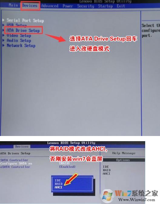 4、切將鍵盤移動(dòng)Devices選項(xiàng),把鍵盤移動(dòng)ATA Drive Setup回車,將configure SATA as中默認(rèn)的raid改成ahci模式,否則安裝win7時(shí)會(huì)出現(xiàn)0x0000007b藍(lán)屏,因?yàn)閣in7中沒有集成raid硬盤驅(qū)動(dòng),然后選擇F10保存設(shè)置,在彈出的選項(xiàng)中選擇YES,如下圖所示;