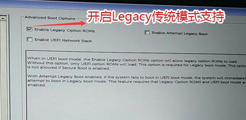 3、切換到Advanced Boot Options將右邊的Enable legacy option roms選項打勾,如下圖所示;