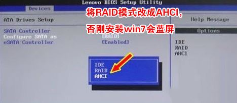 4、切將鍵盤移動(dòng)Devices選項(xiàng),把鍵盤移動(dòng)ATA Drivers setup回車,將configure SATA as中默認(rèn)的raid改成ahci模式,否則安裝win7時(shí)會(huì)出現(xiàn)0x0000007b藍(lán)屏,因?yàn)閣in7中沒有集成raid硬盤驅(qū)動(dòng),然后選擇F10保存設(shè)置,在彈出的選項(xiàng)中選擇YES,如下圖所示;