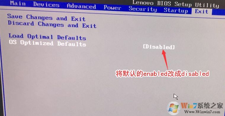 2、轉(zhuǎn)到Exit,把OS Optimized Defaults設(shè)置為Disabled;