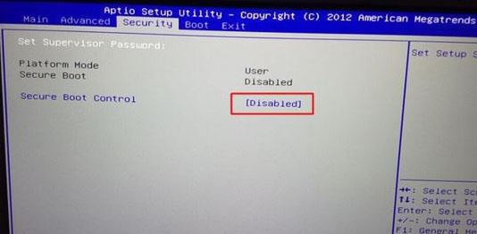 1、重啟筆記本按F2進(jìn)入BIOS設(shè)置,在Security下把Secure Boot Control設(shè)置為Disabled關(guān)閉安全啟動,安裝win7必須要關(guān)閉的一項(xiàng),否則安裝后可能引導(dǎo)不了,如下圖所示;