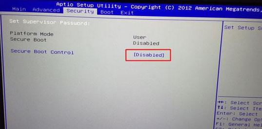 1、重啟筆記本按F2進(jìn)入BIOS設(shè)置,在Security下把Secure Boot Control設(shè)置為Disabled關(guān)閉安全啟動,安裝win7必須要關(guān)閉的一項,否則安裝后可能引導(dǎo)不了,如下圖所示;