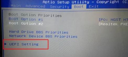 2、轉(zhuǎn)到Boot界面,選擇UEFI Setting回車;