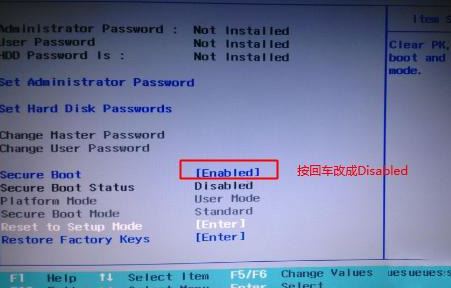 1、開機一直按F2或(FN+F2)進入BIOS,按→方向鍵切換到Security,選擇Secure Boot回車設置成Disabled,如下圖所示;