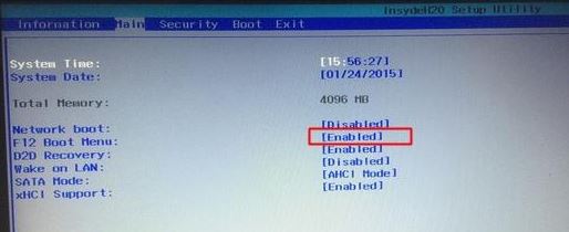 4、轉(zhuǎn)到Main,選擇F12 Boot Menu回車,設(shè)置為Enabled,按F10選擇Yes回車保存修改,如下圖所示;