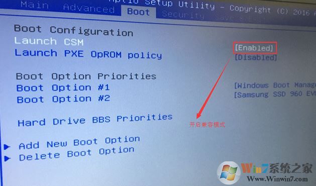 2、切換到BOOT的選項(xiàng),把Launch CSM由disabled改成enabled,開啟兼容模式,然后按F10保存設(shè)置;