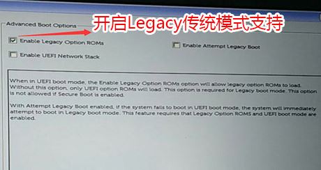 2、切換到Advanced Boot Options將右邊的Enable legacy option roms選項打勾,如圖: