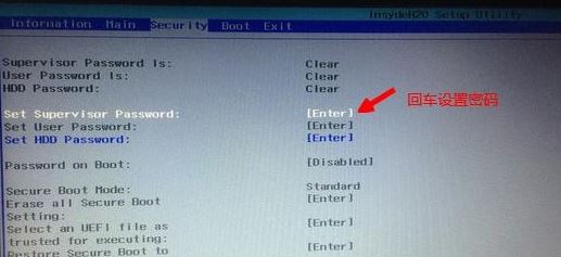 2、如果Secure Boot灰色無法設置,則轉到Security,選擇Set Supervisor Password回車設置密碼,再返回BOOT選項,將Secure BOOT默認enabled為disabled,(注:改完secure boot后再設置密碼為空即可,要不每次進BIOS都要設置)如下圖所示;