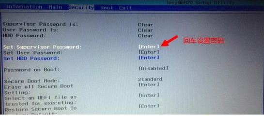 2、如果Secure Boot灰色無法設(shè)置,則轉(zhuǎn)到Security,選擇Set Supervisor Password回車設(shè)置密碼,再返回BOOT選項,將Secure BOOT默認enabled為disabled,(注:改完secure boot后再設(shè)置密碼為空即可,要不每次進BIOS都要設(shè)置)如下圖所示;