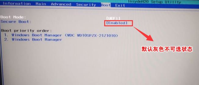 1、開機一直按F2進入BIOS,按F2進入BIOS界面,選擇BOOT項后發(fā)現(xiàn)secure boot灰色不可選狀態(tài),如下圖所示;