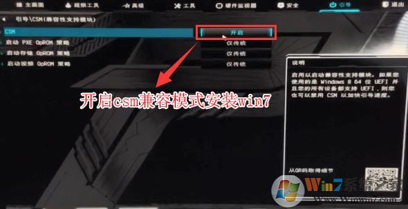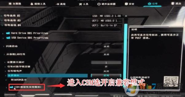 3、再鍵盤方向鍵右鍵切換到"引導(dǎo)"選項(xiàng),進(jìn)入csm菜單開(kāi)啟“兼容模式”,如圖所示;