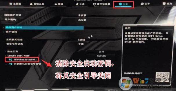 2、按鍵盤方向鍵右鍵切換到"安全"選項(xiàng),選擇下面的“清除安全啟動(dòng)密鑰”將其關(guān)閉安全啟動(dòng)安裝win7,如圖所示;