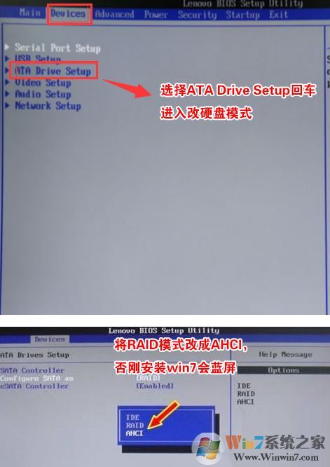 4、切將鍵盤移動(dòng)Devices選項(xiàng),把鍵盤移動(dòng)ATA Drive Setup回車,將configure SATA as中默認(rèn)的raid改成ahci模式,否則安裝win7時(shí)會(huì)出現(xiàn)0x0000007b藍(lán)屏,因?yàn)閣in7中沒有集成raid硬盤驅(qū)動(dòng),然后選擇F10保存設(shè)置,在彈出的選項(xiàng)中選擇YES,如下圖所示;