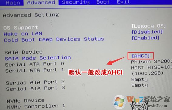 4、再將移動(dòng)上下方向鍵,移動(dòng)到Advanced中將SATA Mode Selection選項(xiàng)的啟動(dòng)項(xiàng)更改為AHCI,否則安裝WIN7會(huì)出現(xiàn)0x00007b藍(lán)屏,如下圖所示,然后再F4保存設(shè)置;