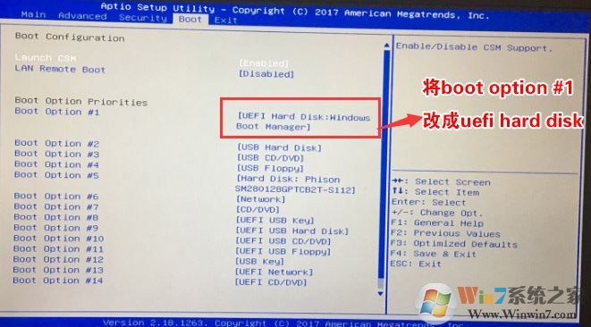 3、再將移動(dòng)上下方向鍵,移動(dòng)將Boot Option #1選項(xiàng)的啟動(dòng)項(xiàng)更改為UEFI Hard Disk:Windows Boot Manager,如下圖所示,然后再F4保存設(shè)置;