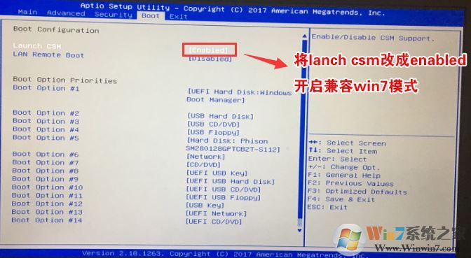 2、再將移動(dòng)左右方向鍵,移動(dòng)到BOOT選項(xiàng)卡下,將Launch CMS更改為Enable,開啟兼容模式,如下圖所示;