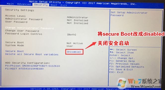 1、重啟筆記本一直按f2進(jìn)入BIOS設(shè)置,在Security下把Secure Boot設(shè)置為Disabled,關(guān)閉"安全啟動(dòng)"如下圖所示;