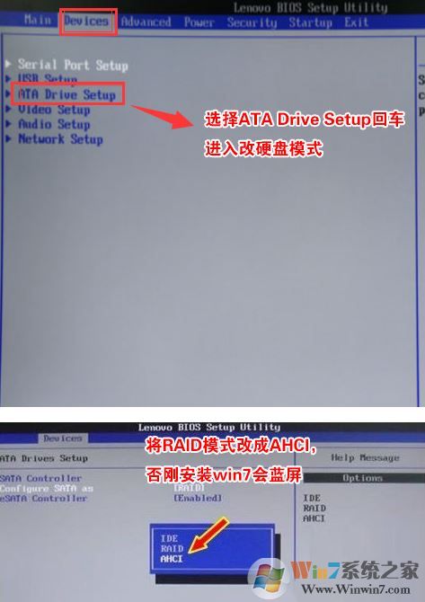 4、切將鍵盤移動(dòng)Devices選項(xiàng),把鍵盤移動(dòng)ATA Drive Setup回車,將configure SATA as中默認(rèn)的raid改成ahci模式,否則安裝win7時(shí)會(huì)出現(xiàn)0x0000007b藍(lán)屏,因?yàn)閣in7中沒(méi)有集成raid硬盤驅(qū)動(dòng),然后選擇F10保存設(shè)置,在彈出的選項(xiàng)中選擇YES,如下圖所示;