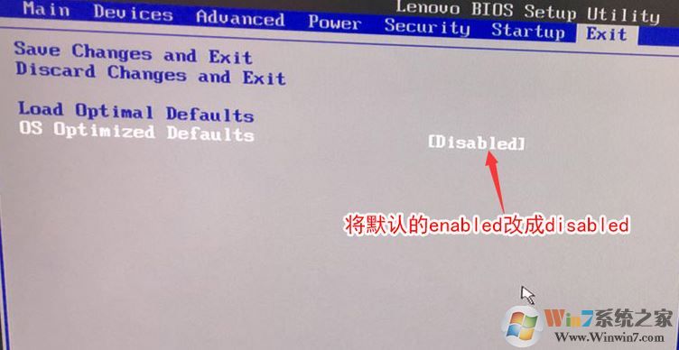 2、轉(zhuǎn)到Exit,把OS Optimized Defaults設(shè)置為Disabled,如下圖所示;