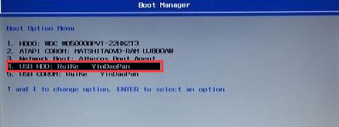 5、插入U(xiǎn)盤啟動(dòng)盤,重啟時(shí)不停的按下f12,打開Boot Manager,選擇USB HDD回車從U盤啟動(dòng),如截圖: