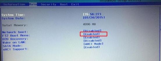 4、轉(zhuǎn)到Main,選擇F12 Boot Menu回車,設(shè)置為Enabled,按F10選擇Yes回車保存修改,如圖: