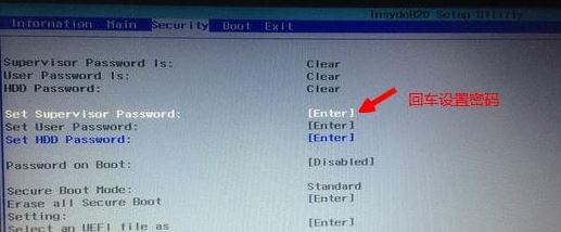 2、如果Secure Boot灰色無法設(shè)置,則轉(zhuǎn)到Security,選擇Set Supervisor Password回車設(shè)置密碼,再返回BOOT選項(xiàng),將Secure BOOT默認(rèn)enabled為disabled,(注:改完secure boot后再設(shè)置密碼為空即可,要不每次進(jìn)BIOS)