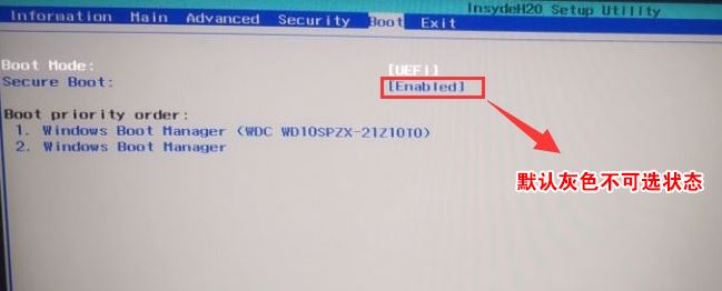 1、方法大同小異,開機(jī)一直按F2進(jìn)入BIOS,按F2進(jìn)入BIOS界面,選擇BOOT項(xiàng)后發(fā)現(xiàn)secure boot灰色不可選狀態(tài),如下圖所示;