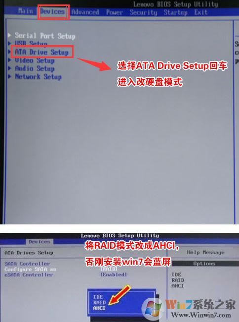 4、切將鍵盤移動Devices選項,把鍵盤移動ATA Drive Setup回車,將configure SATA as中默認的raid改成ahci模式,否則安裝win7時會出現(xiàn)0x0000007b藍屏,因為win7中沒有集成raid硬盤驅(qū)動,然后選擇F10保存設(shè)置,在彈出的選項中選擇YES,如下圖所示: