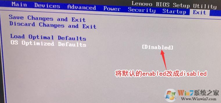 2、轉(zhuǎn)到Exit,把OS Optimized Defaults設(shè)置為Disabled,如下圖所示;