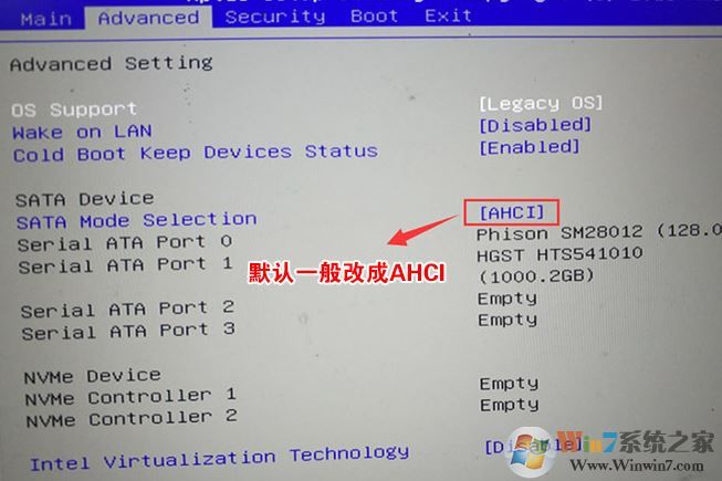 4、再將移動上下方向鍵,移動到Advanced中將SATA Mode Selection選項的啟動項更改為AHCI,否則安裝WIN7會出現(xiàn)0x00007b藍屏,如下圖所示,然后再F4保存設置,如圖: