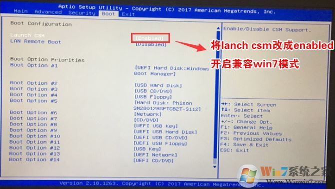 2、再將移動左右方向鍵,移動到BOOT選項卡下,將Launch CMS更改為Enable,開啟兼容模式,如圖: