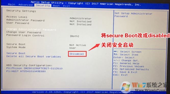 1、重啟筆記本一直按f2進入BIOS設置,在Security下把Secure Boot設置為Disabled,關閉"安全啟動"如圖所示: