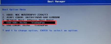 5、插入U(xiǎn)盤(pán)啟動(dòng)盤(pán),重啟時(shí)不停的按下f12,打開(kāi)Boot Manager,選擇USB HDD回車(chē)從U盤(pán)啟動(dòng),如圖所示;
