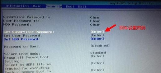 2、如果Secure Boot灰色無(wú)法設(shè)置,則轉(zhuǎn)到Security,選擇Set Supervisor Password回車(chē)設(shè)置密碼,再返回BOOT選項(xiàng),將Secure BOOT默認(rèn)enabled為disabled,(注:改完secure boot后再設(shè)置密碼為空即可,要不每次進(jìn)BIOS都要設(shè)置)如下圖所示;