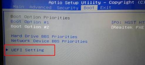 2、轉(zhuǎn)到Boot界面,選擇UEFI Setting回車;