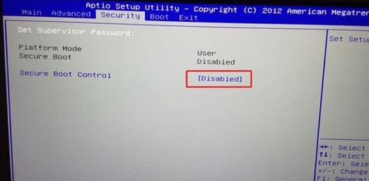1、重啟筆記本按F2進入BIOS設(shè)置,在Security下把Secure Boot Control設(shè)置為Disabled,其將安全啟動關(guān)閉才能安裝win7,如圖所示;
