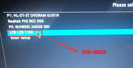 4、插入U盤啟動盤,重啟按ESC選擇識別到U盤啟動項,回車;