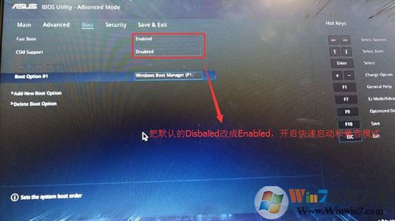 2、重啟后切換到BOOT的選項,分別把fast boot和csm support由disabled改成enabled,分別開啟快速啟動和兼容模式;