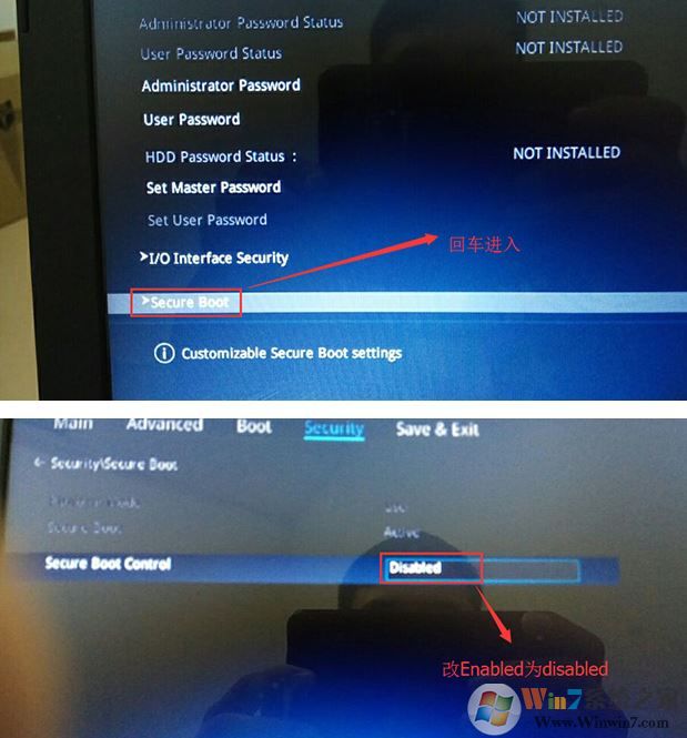 1、重啟筆記本按esc進入BIOS設(shè)置,然后按F7進入高級模式,按→方向鍵移動到Security,選擇Secure Boot,然后回車進入把Secure Boot control選enabled改為disabled關(guān)閉安全啟動,然后按F10保存重啟;