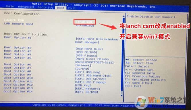 2、再將移動左右方向鍵,移動到BOOT選項卡下,將Launch CMS更改為Enable,開啟兼容模式,如下圖所示;