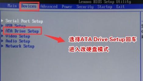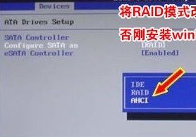 4、切將鍵盤移動Devices選項,把鍵盤移動ATA Drive Setup回車,將configure SATA as中默認(rèn)的raid改成ahci模式,否則安裝win7時會出現(xiàn)0x0000007b藍(lán)屏,因為win7中沒有集成raid硬盤驅(qū)動,然后選擇F10保存設(shè)置,在彈出的選項中選擇YES,如下圖所示;