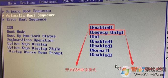 3、切換到Boot,把Boot Mode從UEFI改成Legacy only引導(dǎo)模式,再把csm默認(rèn)disabled改成enabled,開啟兼容模式,選擇F10保存設(shè)置,在彈出的選項中選擇YES;