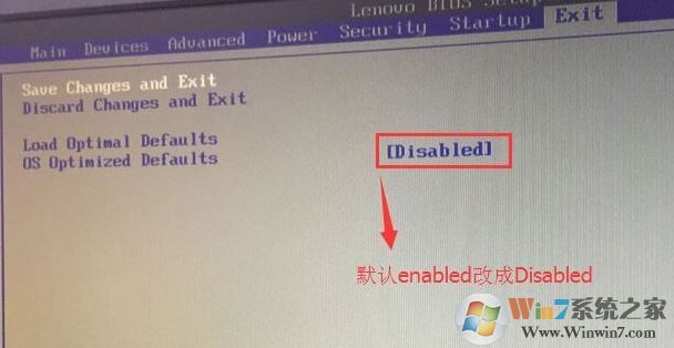 2、轉(zhuǎn)到Exit,把OS Optimized Defaults設(shè)置為Disabled,改成支持win7系統(tǒng)模式,如下圖所示;